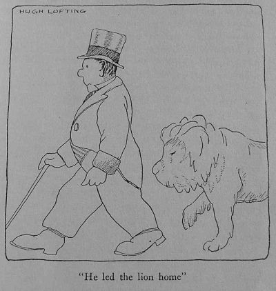 Then he led the lion home. And the terrified townsfolk watched through the cracks of doors as the dread animal strolled down the street as John Dolittle's heels as meek and quiet as a lamb.