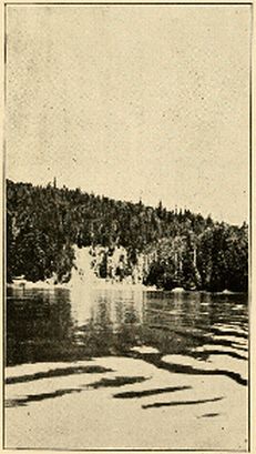 In the morning when we awoke the lake was spread before us in all its placid beauty. There[244] was a gentle westerly breeze, and we made haste to cut a couple of poles and rig a sail out of the tarpaulin. We had visions of descending the lake in a single day and night. Raising the sail, however, had a fatal effect upon the wind, as it had had when we tried it the last time, and after drifting a mile, we were obliged to take it down and return to the paddles. The course for small boats is from point to point of the north shore to a strait half-way, known as the Narrows. Here you cross over to the south shore and continue. When the wind blows, as it nearly always does, a sea rolls through the Narrows like the billows of the Atlantic. Hence the place has a bad name.