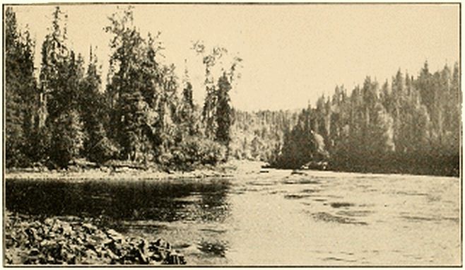 Next morning we were on our way before our kind hosts were astir. We felt the usual embarrassment about offering pay for our entertainment, but in this case we got around it by leaving some shells which fitted the young man's rifle. The day broke clear and cold. We made famous speed with the current, and pricked off our progress on the map at a highly encouraging rate. What I have already said of the river applies to this day too. We rounded innumerable pine-clad points, and traversed one long reach after another. The glory of the autumn tints was fast departing, for the poplars were shedding their leaves. There were several so-called rapids en route, but some of them were scarcely discernible.