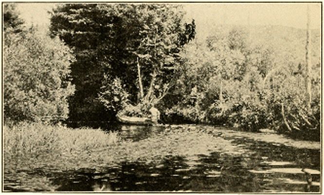 Though this sort of thing is to be found everywhere, it is none the less beautiful. The light died away very slowly, and the brown stream flowed serenely between the graceful, still trees;[261] the grasses dipped in the water alongshore, and the musk-rats as they swam back and forth made arrowy paths of ripples that caught the light. We went ashore at dark, warned by the voice of the first little rapid below, and camped and feasted in one of the glassy glades. The Blunderbuss lay in deep water at the edge of the grass as if moored to a wharf; but the musk-rats had a high old time jumping in and out, until we pulled her out high and dry.