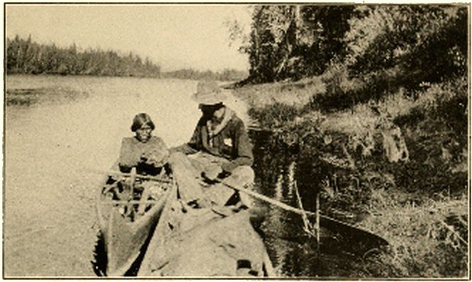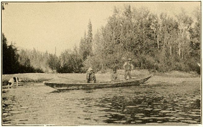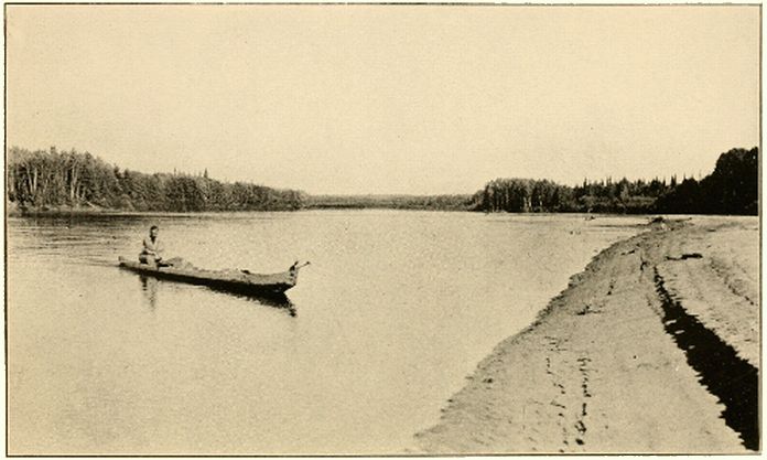 The settlement at the lower end of the lake is afflicted with the name of Saw Ridge, pronounced of course to rhyme with porridge. The change here was even more striking than at Grouard. Five years ago Tom Lilac's two little log shacks crouched alone among the sand dunes. Now there are three modern stores, a telegraph office, and a cable ferry. We had a sad sense that civilization was getting an inexorable grip on us, and we lingered no longer than was necessary to buy grub and to inquire about the steamboat. We learned that she had lain at Saw Ridge all night, and our friends were only an hour or two ahead of us on the river.