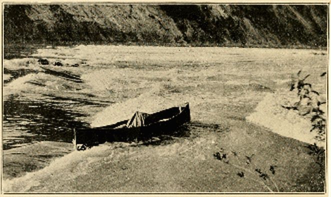 We made ten miles or more before the steamer overtook us, and we had high hopes of beating it out. I had a pleasant recollection of another night that I had floated down this river by the light of the Aurora. Unfortunately a thunderous cloud came rolling up, and we were compelled to go ashore and pitch the tent for shelter. We ate our supper while it rained and thundered a little, but it was one of those abortive squalls that hang fire. The rain stopped, but the clouds refused to clear. After waiting a while, we decided to chance it, and making our beds in the boat, we pushed off in the current. My partner turned in, while I sat up to take the first watch. We couldn't both sleep, because there are rapids in the Athabasca.