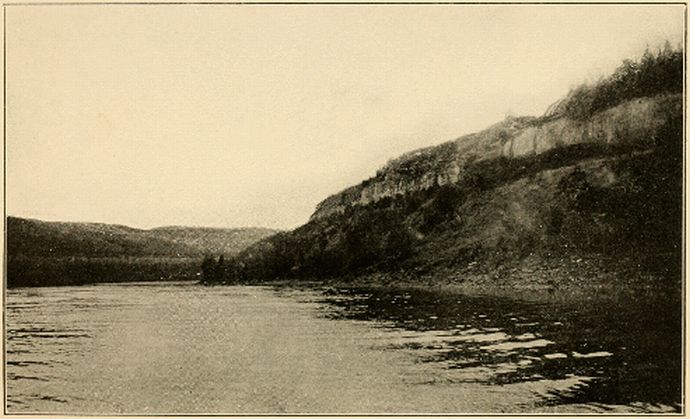 It is a wide, shallow, swift stream full of shoals, and at this season of low water, showing wide, bare stretches of stony shores. It has the look of a "big" river; there are beautiful long vistas and noble bluffs, but it lacks the serene majesty of its sister, the Peace. The banks are much lower for one thing, and it betrays the unquiet nature of a shallow stream—or a person. We had seventy-five miles of it to descend. At intervals along the banks there are stopping-houses[264] for the freighters in the winter, but at this season not many of them are inhabited.