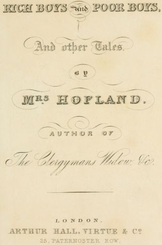 "Never, my dear boy, I really believe, if you do not fail in your duties as a master, for Ned has been well educated in the best sense of the word, being humble and docile without servility, and honest without boldness; and building his sense of duty to his master on his higher duties to his God. The conduct of his whole family, under the trial of improving circumstances, is a guarantee for his; and I hope that you will do credit to yours also, by proving that you know how to guide and protect a favourite dependant, without degradation to yourself, or injurious indulgence to him. The highest and lowest are linked together in the great chain of society for mutual benefit, yet are they separate parts, and have separate duties; remember this, and so will real benefit accrue, both to the 'Rich Boy and the Poor Boy.'"