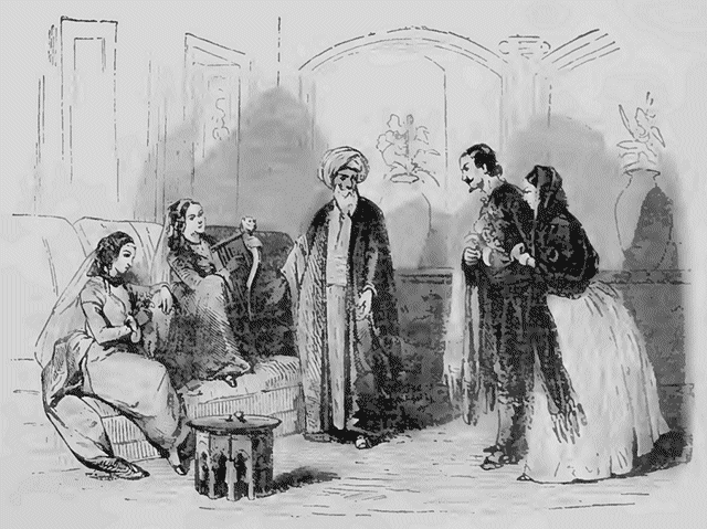 Avant qu'ils eussent fini, une fenêtre s'était ouverte, et une jeune dame avait paru derrière les barreaux; elle écouta attentivement les chanteurs. Aussitôt le couplet achevé, don Christoval adressa la parole à la maîtresse de ce logis, et renouvela sa requête, si brutalement repoussée par le portier. La dame avança le bras hors des barreaux comme pour faire un signe d'assentiment, puis elle se retira, et la fenêtre fut refermée.... Mais quelques minutes après, la grand'porte s'ouvrit, et le portier, tenant une lanterne, vint chercher les étrangers. Il s'empara du cheval en grommelant: «Vous eussiez mieux l'ait de rester dehors; vous n'avez pas voulu me croire; c'est votre affaire!» Et, sans même retourner la tête, il se dirigea vers l'écurie. Un laquais se présenta à sa place, et introduisit les hôtes dans un salon étincelant de lumière. Les meubles, les draperies relevées de franges d'or, tout ce luxe annonçait une demeure où le bon goût s'alliait avec l'opulence. On voyait aux quatre coins des caisses d'arbustes fleuris; les consoles étaient chargées de grands vases de porcelaine de la Chine remplis de fleurs, et tout autour de ce lieu de délices régnait un large divan avec des coussins d'étoffe de soie cramoisie pareille aux tentures. Trois personnes étaient assises sur le divan: un vieillard majestueux, habillé, à la mode orientale, d'un riche cafetan bleu, et coiffé d'un turban de mousseline aussi blanche que la barbe vénérable qui lui descendait jusqu'au milieu de la poitrine. Deux jeunes dames étaient à ses côtés, parées avec élégance et belles comme le jour. L'une, qui paraissait l'aînée, était brune et avait à la main un bouquet de roses muscades; l'autre était blonde et tenait un luth ou théorbe de forme antique. Le vieillard se leva pour faire honneur à ses hôtes: «Soyez les bienvenus sous mon toit, leur dit-il; je vous présente mes deux filles, Amine et Rachel.» Rachel était la musicienne.