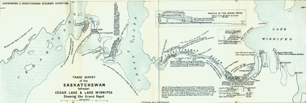 Here on the Saskatchewan every paddle-dip, every twist and turn of the supple canoes, revealed some new caprice of the river's moods. In places the current would be shallow and the canoes would lag. Then the paddlers must catch the veer of the flow or they would presently be out waist-deep shoving cargo and craft off sand bars. Again, as at Grand Rapids, where the banks were rock-faced and sheer, the canoes would run merrily in swift-flowing waters. No wonder the Indian voyageurs regarded all rivers as living personalities and made the River Goddess offerings of tobacco for fair wind and good voyage. And it is to be kept in mind that no river like the Saskatchewan can be permanently mapped. No map or chart of such a river could serve its purpose for more than a year. Chart it to-day, and perhaps to-morrow it jumps its[Pg 4] river bed; and where was a current is now a swampy lake in which the paddlemen may lose their way.