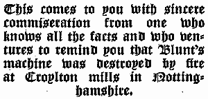 We are addressing you on behalf of our client, Mr. Leonard Blunt, who has been absent from business for some years. Mr. Leonard Blunt finds, very much to his surprise, that you have been manufacturing the Woolito goods for a considerable period of time in colours, as well as in the natural material. We desire to point out to you that your action in this respect constitutes an infringement of the patent belonging to our client, particulars of which you will find in Volume Number 7 of Textile Patents, at the Head Office in Cornhill.