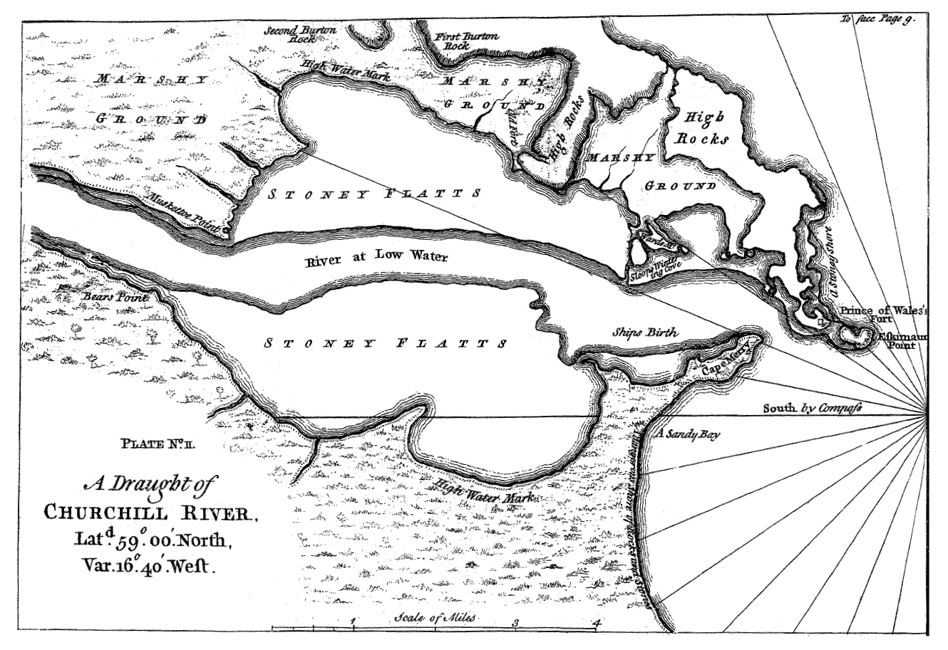 We sailed out of Churchill-river, and soon arrived at York-fort upon Hayes's-river, where the ship was to deliver her cargo and take in another. After her departure for England, I applied myself to the setting up beacons in order to make a chart of the river. The governor, who had resided in the country twenty years, was perfect master of the traditional history of it, even from the first settlement of the English; and being a free and communicative man, he used frequently to entertain us with a regular account of all the principal events and discoveries; to which the linguists seldom failed to add the information they had gathered from the natives. By their means I soon obtained a general knowlege of the country, as well inland as upon the coasts.