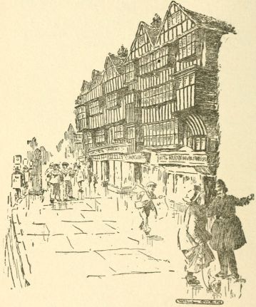 At this time shops were built against the church walls, as you will still find them against St. Ethelburga's in Bishopsgate Street. Every shop front had its projecting sign hanging precariously over the pedestrian. The roads and pavings were of the petrified kidney pattern with posts to indicate where the paving began.